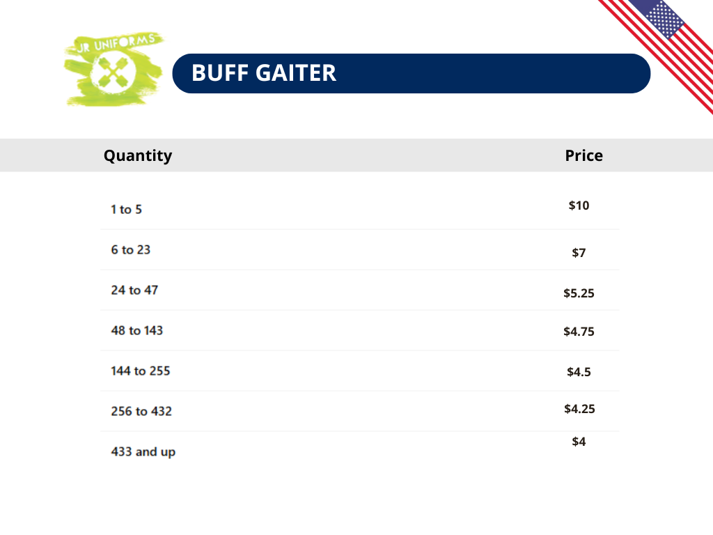 | Quantity | 1 to 5, 6 to 23, 24 a 47, 48 a 143, 144 a 255, 256 a 432, 433 and up |